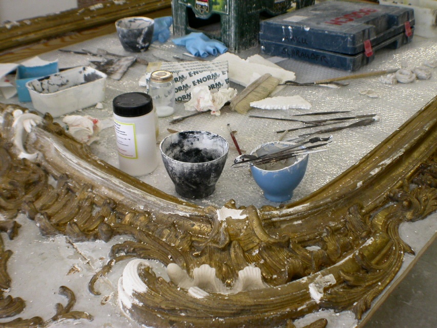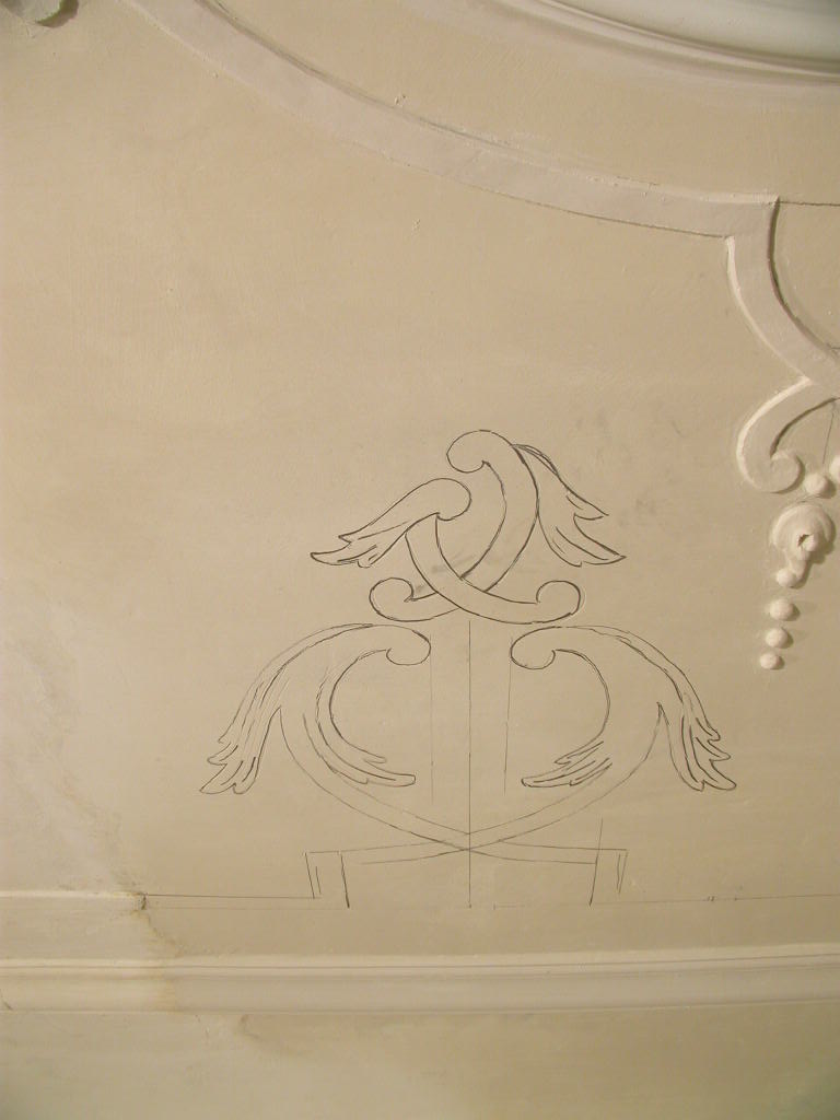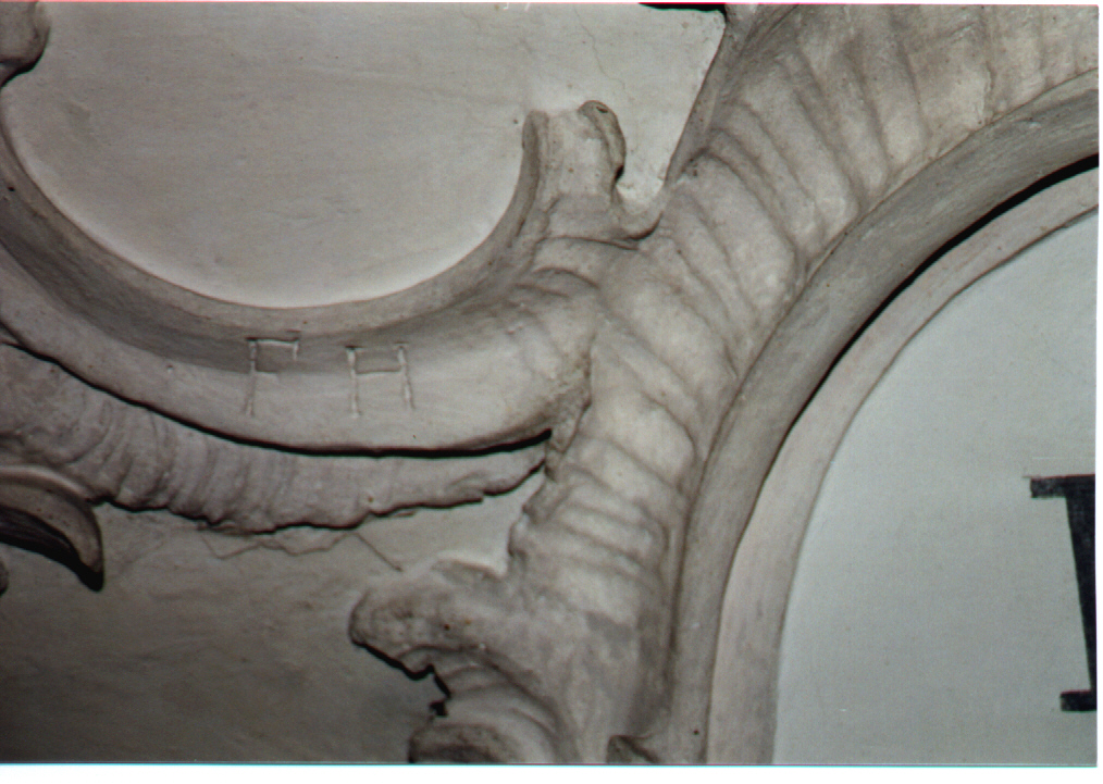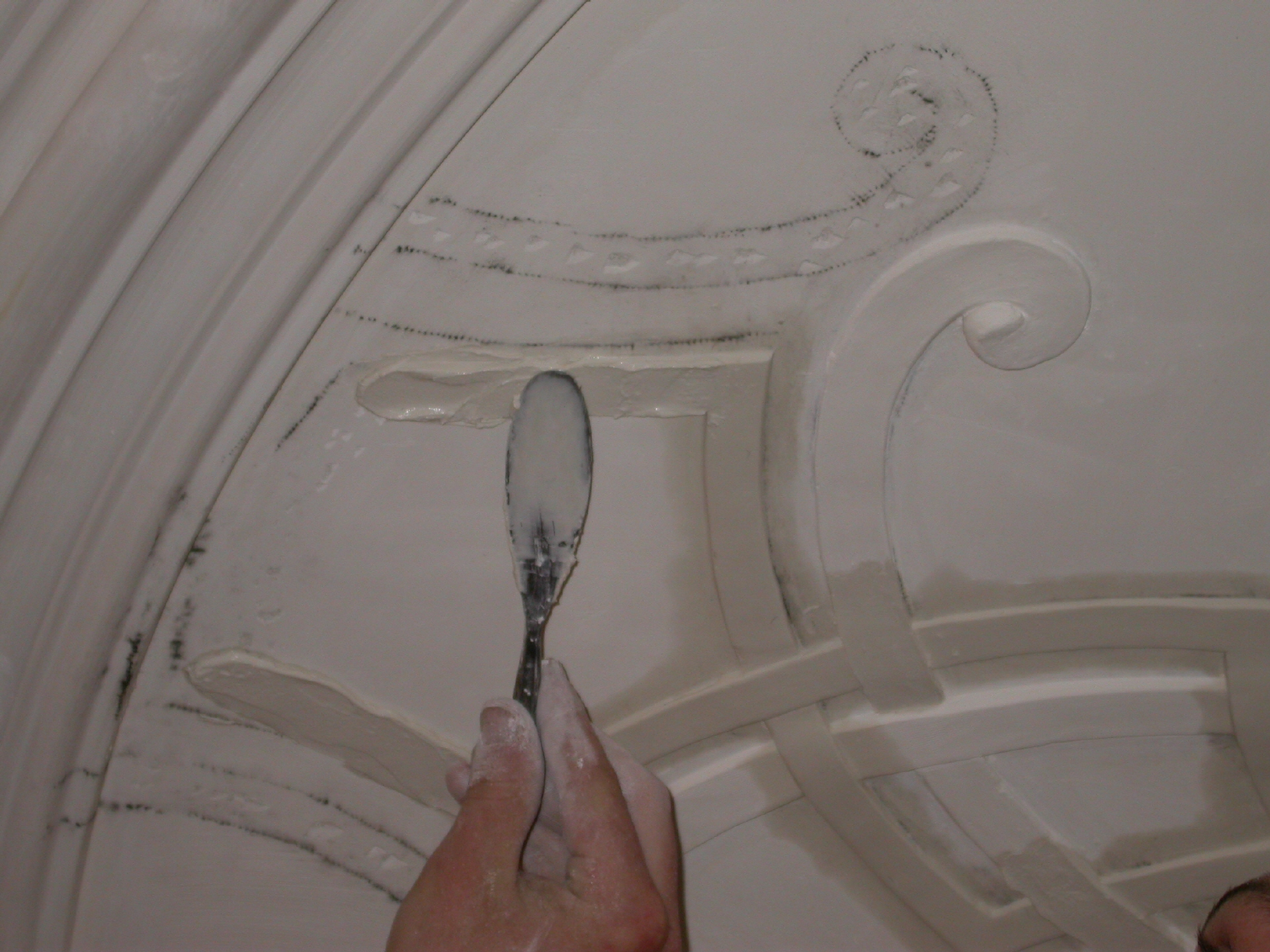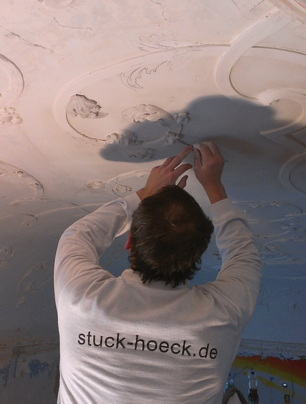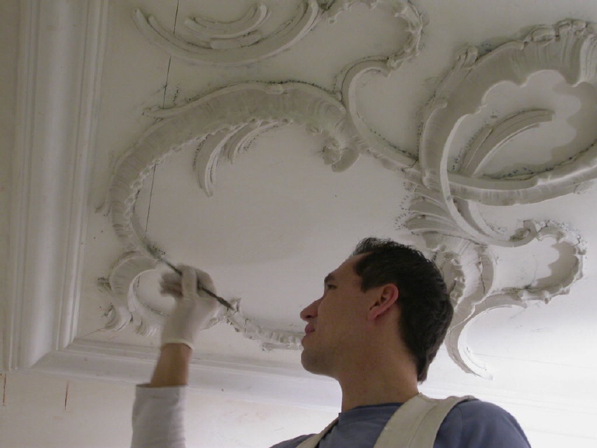 Antragearbeiten: Antragsstuck - Ausarbeitung plastischer Stuckelemente an Ort und Stelle in die noch weiche Stuckmasse in einem meist raschen Arbeitsgang, was große Kunstfertigkeit erfordert (v.a. im Barock und Rokoko angewandt).